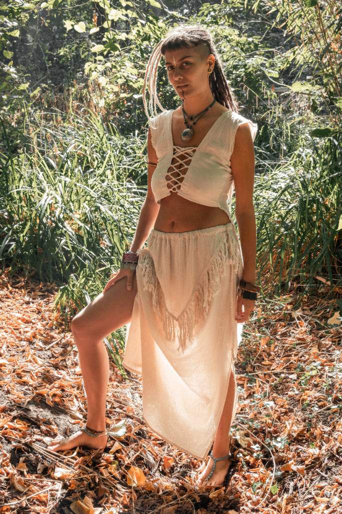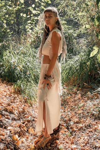 Handmade long cotton skirt with fringes and side slits. Adjustable side straps make this skirt very comfortable and fitting.